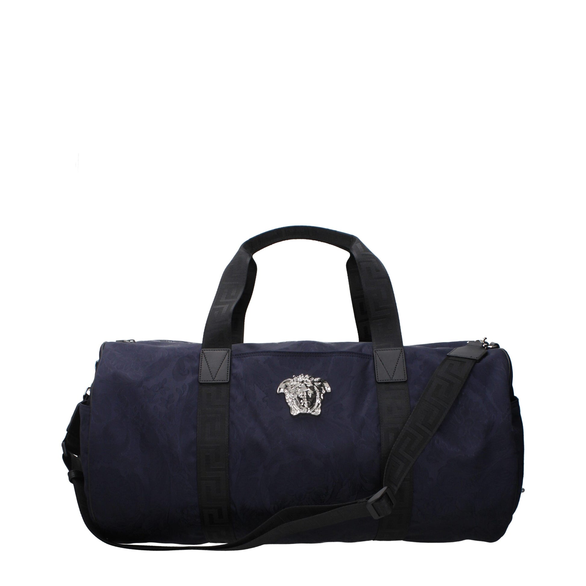 The product with MPN 10155711A133041U04P and code F84033 fabric in blue is a travel bags designed by Versace. It has features like front detail, adjustable shoulder, removable shoulder.