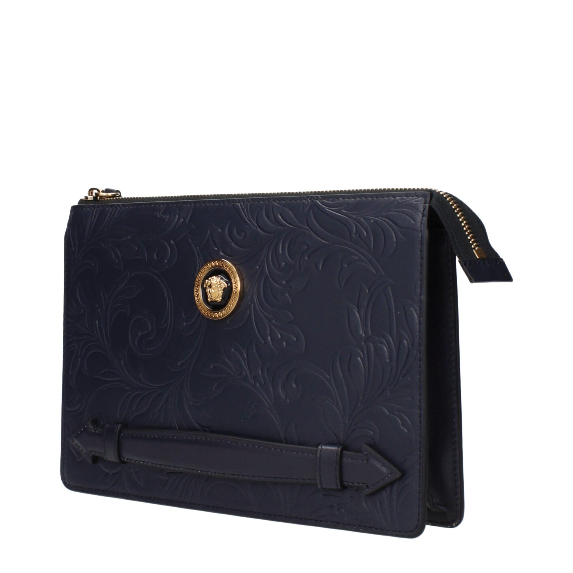 The product with MPN 10133651A139531U02V and code F84034 leather in blue is a clutches designed by Versace. It has features like front detail.